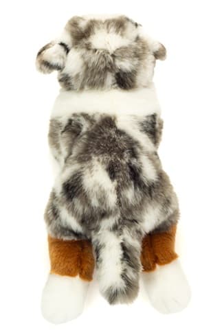 Le berger australien de 40 cm séduit par ses marques de robe détaillées et son regard fidèle. Couché dans une position détendue et avec ses traits du visage soigneusement travaillés, il paraît particulièrement vif et accessible. Sa fourrure ultra-douce, déclinée dans différentes nuances de gris, de brun et de blanc, invite aux câlins, aux jeux et à l’amour.