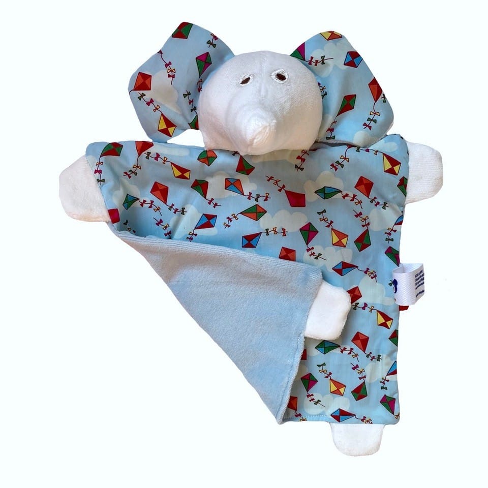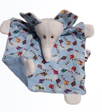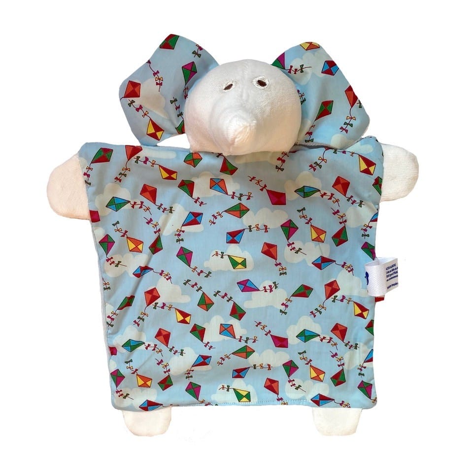 Doudou élephant plat en velours blanc et bleu, avec popeline imprimée de coton biologique GOTS. Différents motifs proposés : cerf-volant, jungle et Paris.