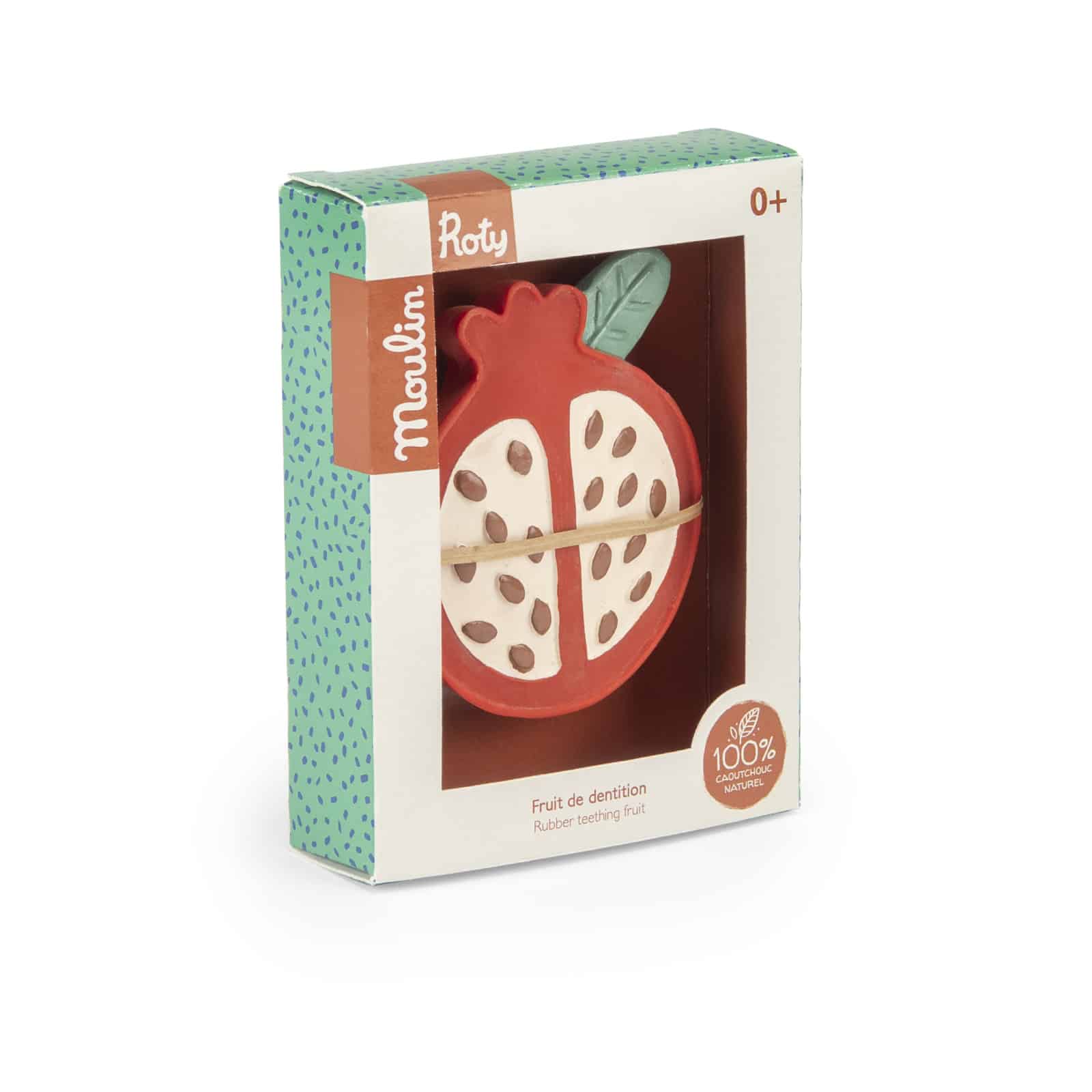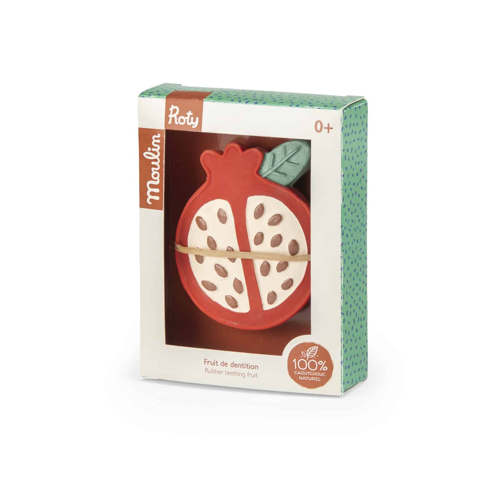 Fruit de dentition 100% caoutchouc naturel, issu de la sève d’Hévéa. En forme de grenade, il est facile à manipuler pour soulager les dents. Sans trou ni sifflet pour éviter l’accumulation de saletés à l’intérieur, il s’utilise sans problème dans le bain.