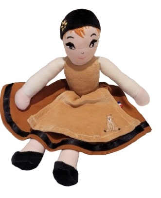 Lola l’alsacienne est la gardienne « Terre d’Ours », avec son tablier brodé du logo de la boutique. Elle plaira aux enfants et aux grands, tant par sa magnifique coiffe brodée avec des fleurs (selon le modèle original d’une sous-coiffe traditionnelle alsacienne), que pour son allure moderne aux teintes douces.