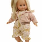 Notre Schlummerle est sans doute l’une des poupées les plus connues et les plus populaires au monde. Son corps en tissu tout doux la rend irrésistible. Fabriquée dans notre propre usine de poupées à Rauenstein, en Thuringe, elle possède des bras, des jambes et une tête en vinyle. Ses yeux bleus sont adorables, et ses cheveux blonds, résistants et faciles à coiffer, sont agrémentés d’un bandeau. Elle porte une tenue de printemps robe et legging, facile à enfiler et à retirer, et lavable à la main à 30 degrés.